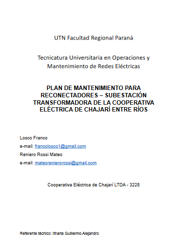 PLAN DE MANTENIMIENTO PARA RECONECTADORES, SUBESTACIÓN TRANSFORMADORA DE LA COOPERATIVA ELÉCTRICA DE CHAJARÍ ENTRE RÍOS