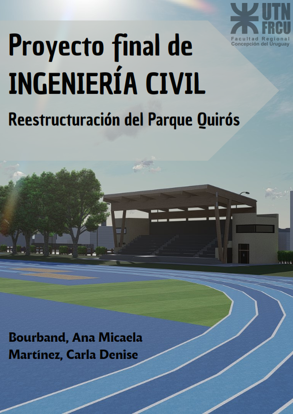 In the city of Colón, through a project data bank proposed by the municipality and the “Proyecto Final” chair from the Regional Faculty of Concepción del Uruguay it is proposed the modernization of Quirós Park. Before beginning with the project development, interviews were carried out and visits were paid, in which the Secretary of Sports Municipality and P.E. teachers from the athletic school put forward their desire to have an athletic track so local athletes can train properly. After having characterized and studying its potentialities, we continued with the analysis of similar infrastructural background at a regional and international level. It was noticed that it was not only important but also necessary to have high quality sports facilities in the city in order to prevent athletes from commuting to other towns to train and practise different disciplines. Initially, two alternatives were put forward: keeping the size of the track but improving its material or building a class 2 track with all the facilities needed for each discipline. After evaluating the advantages and disadvantages of both options and carrying out a SWOT analysis, it was agreed that expanding the track and sheathing it with synthetic material was the most convenient option for the city and its compromise with sports. Apart from the track project, it was proposed to improve the existent stands trough the construction of a cover of laminated timber wood structure, a type of material available nearby. The whole Project was designed based on the aim of keeping Quirós Park as a sports venue, without loosing it recreational and historical value for all citizens. Finally, a study on environmental impact was carried out in order to establish mitigation measures facing possible environmental repercussions after altering a part of the park.
