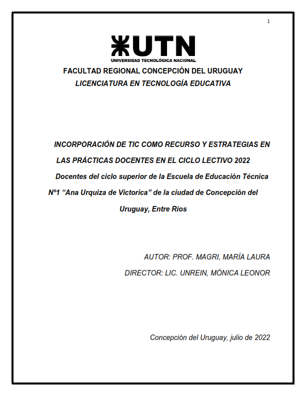 Incorporación de TIC como recurso y estrategias en las prácticas docentes en el ciclo lectivo 2022 : docentes del ciclo superior de la Escuela de Educación Técnica No 1 “Ana Urquiza de Victorica” de la ciudad de Concepción del Uruguay, Entre Ríos